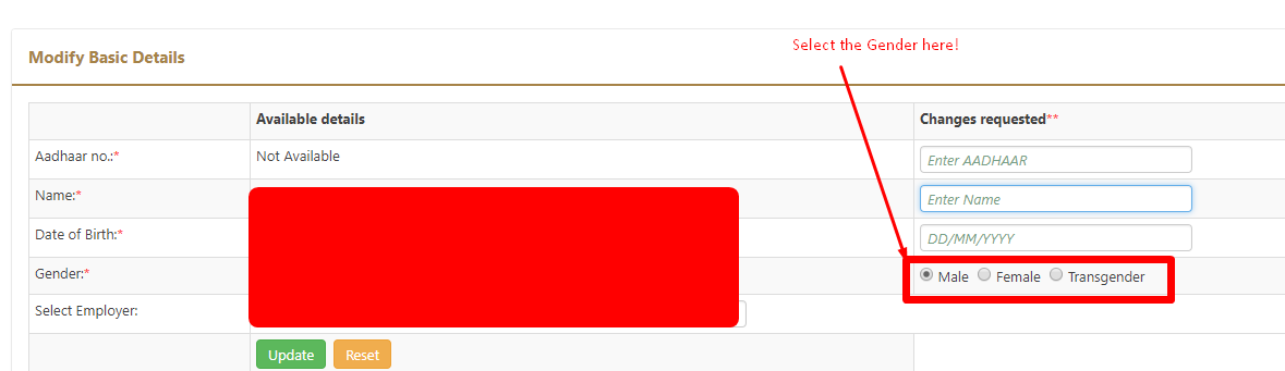 3. Enter the correct Gender as in your Aadhaar and then click on the Update button